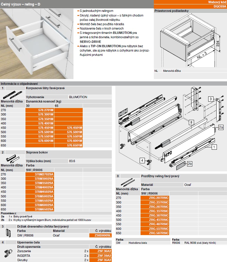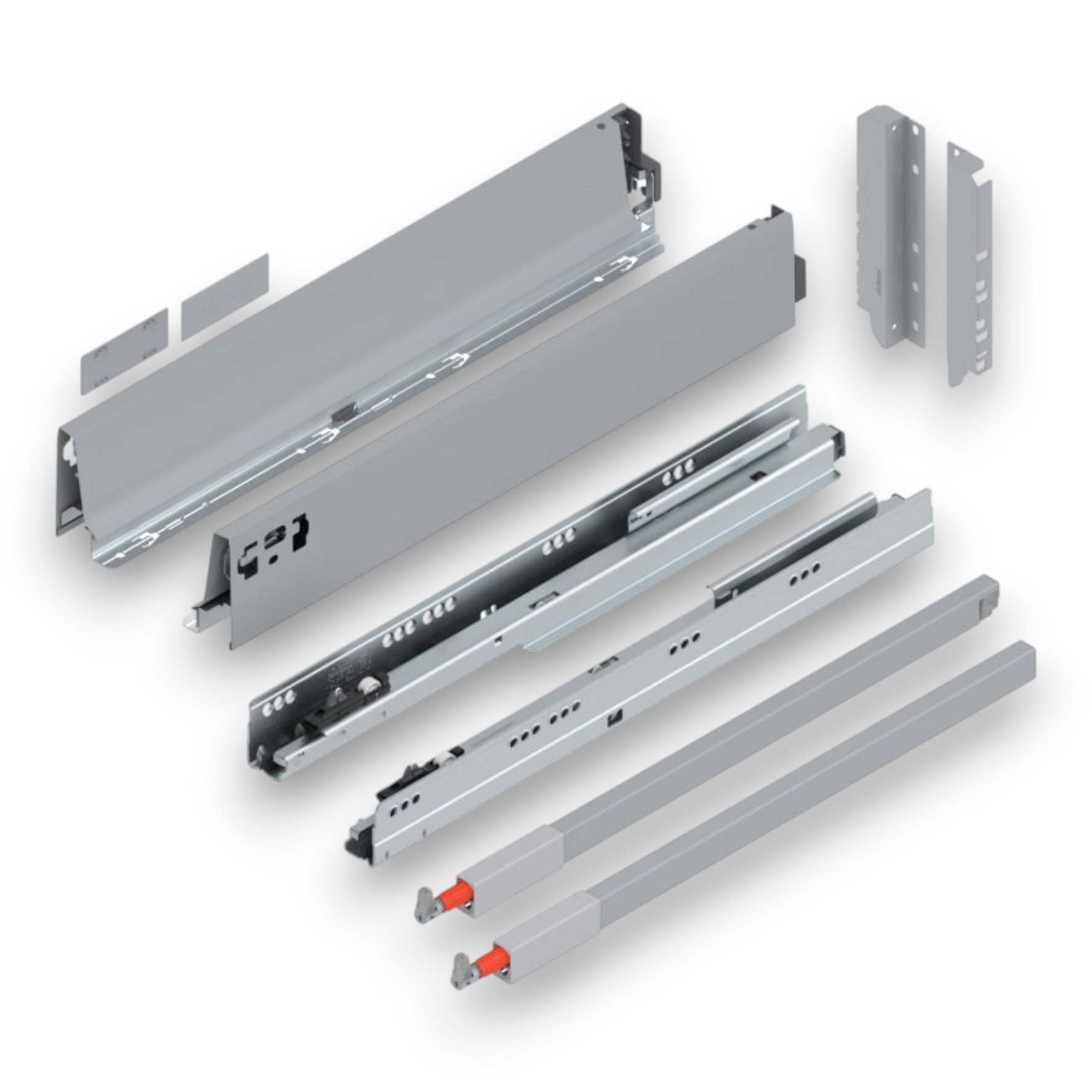 BLUM TANDEMBOX ANTARO, Výška "D" s Relingom, 65 kg, Sivá (RAL 9006) – Kompletná Sada s Tlmením Vytvorte si moderné a funkčné, extra vysoké a veľmi odolné zásuvky s kompletnou sadou BLUM TANDEMBOX ANTARO. Elegantné sivé prevedenie v odtieni RAL 9006 (biely hliník) kombinuje minimalistický dizajn s preverenou technológiou pre ľahký chod a komfortné tlmené zatváranie. Ideálne pre maximálne využitie úložného priestoru pri vysokých čelách a zvýšených nárokoch na nosnosť.