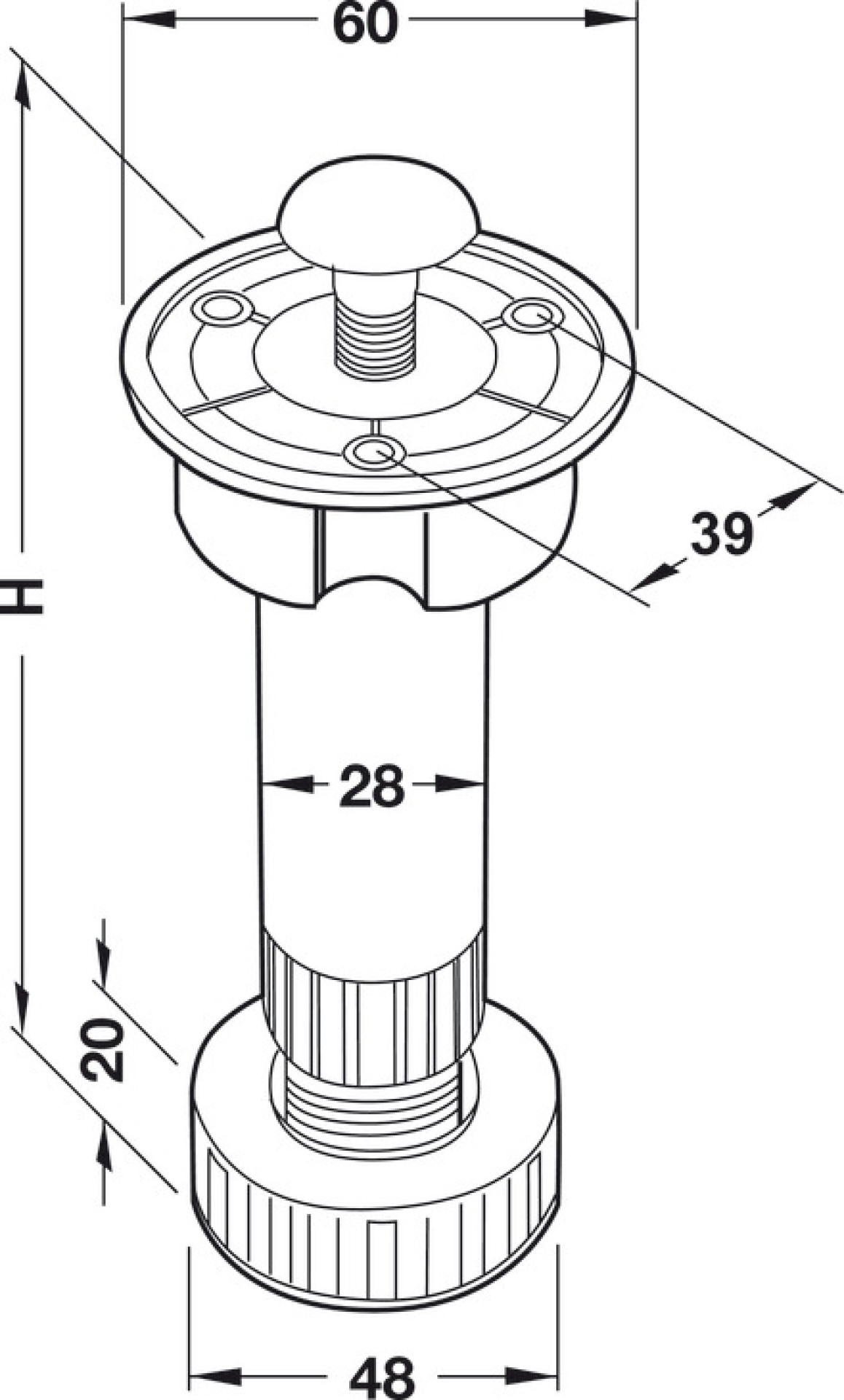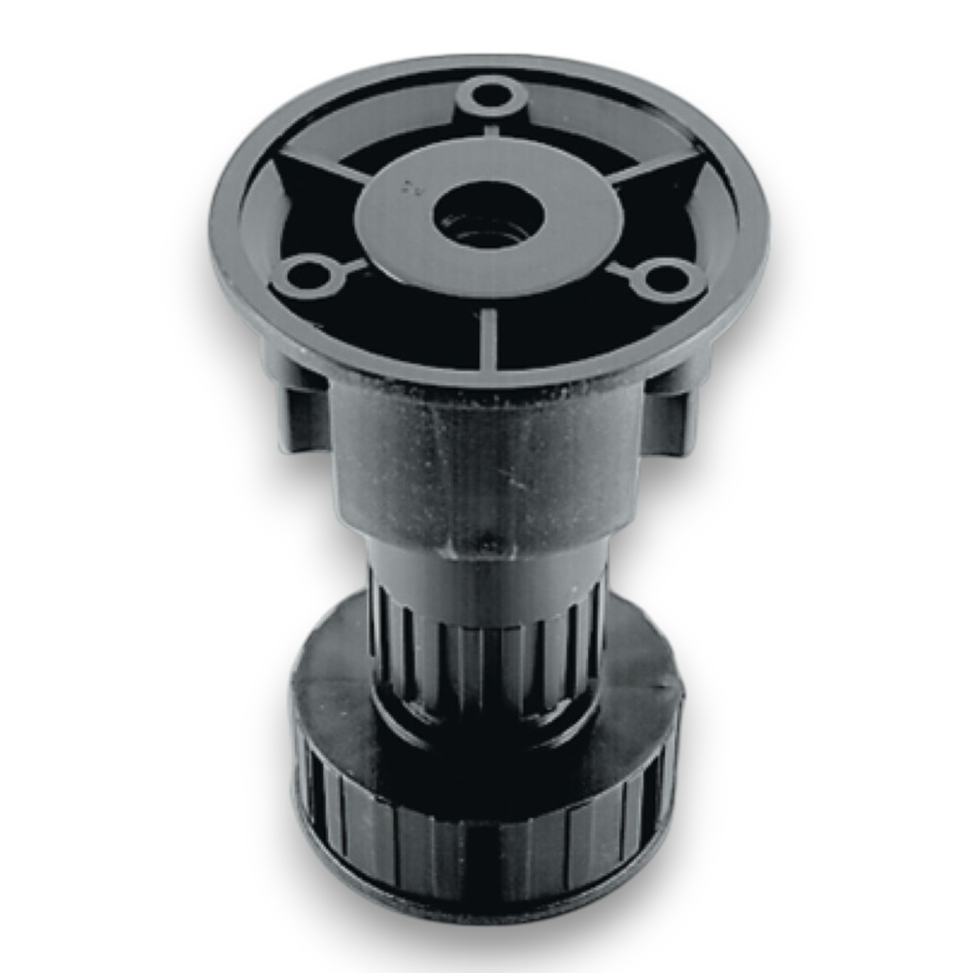 Trojdielna kuchynská noha s odnímateľnou prírubou. Rektifikácia nohy v rozsahu -5/+10 mm.