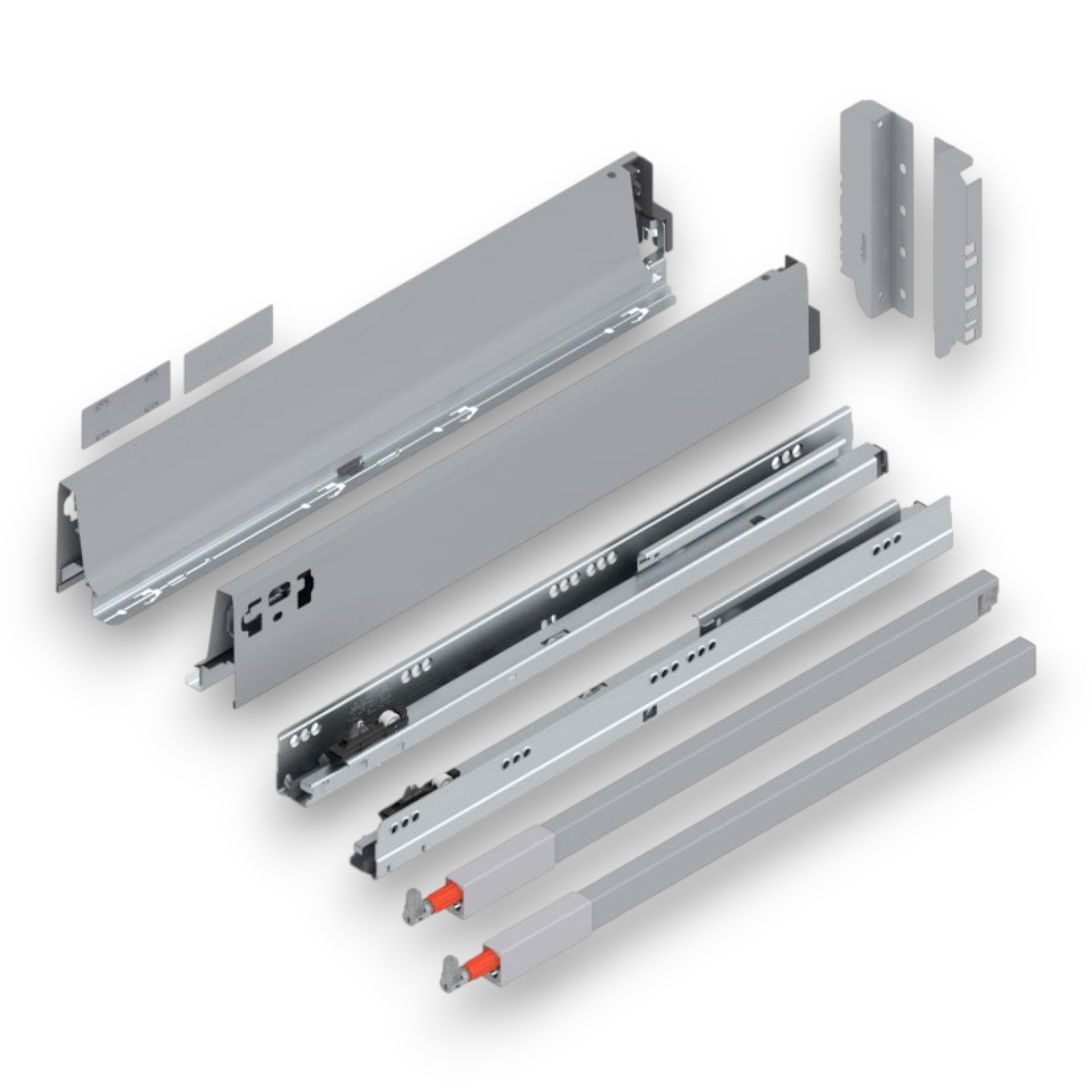 BLUM TANDEMBOX ANTARO, Výška "C" s Relingom, 30 kg, Sivá (RAL 9006) – Kompletná Sada s Tlmením Vytvorte si moderné a funkčné, vysoké zásuvky s kompletnou sadou BLUM TANDEMBOX ANTARO. Elegantné sivé prevedenie v odtieni RAL 9006 (biely hliník) kombinuje minimalistický dizajn s preverenou technológiou pre ľahký chod a komfortné tlmené zatváranie. Ideálne pre uloženie vysokých predmetov v kuchyni alebo kúpeľni.