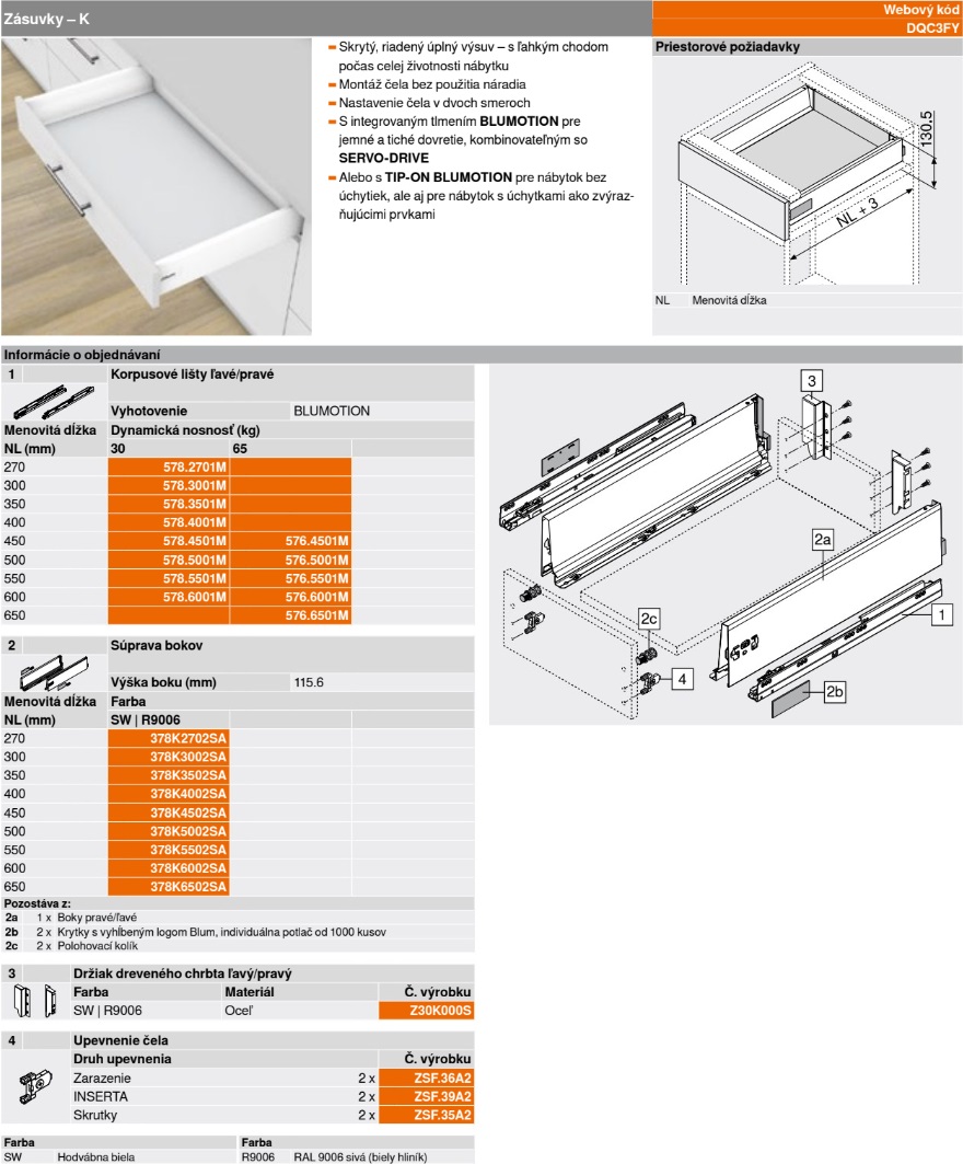 BLUM TANDEMBOX ANTARO, Výška "K", 65 kg, Sivá (RAL 9006) – Kompletná Sada s Tlmením Vytvorte si moderné a funkčné, vysoko zaťažiteľné zásuvky s kompletnou sadou BLUM TANDEMBOX ANTARO. Elegantné sivé prevedenie v odtieni RAL 9006 (biely hliník) kombinuje minimalistický dizajn s preverenou technológiou pre ľahký chod a komfortné tlmené zatváranie. Ideálne pre stredne vysoké, ale ťažké zásuvky (napr. na potraviny alebo kuchynský riad).