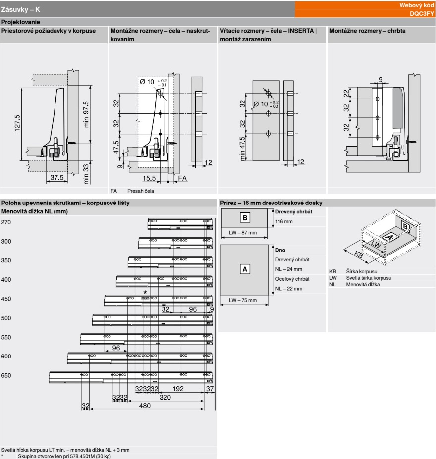 Výška bokov: "K" (vyšší bok s relingom, svetlosť výsuvu 130,5 mm)