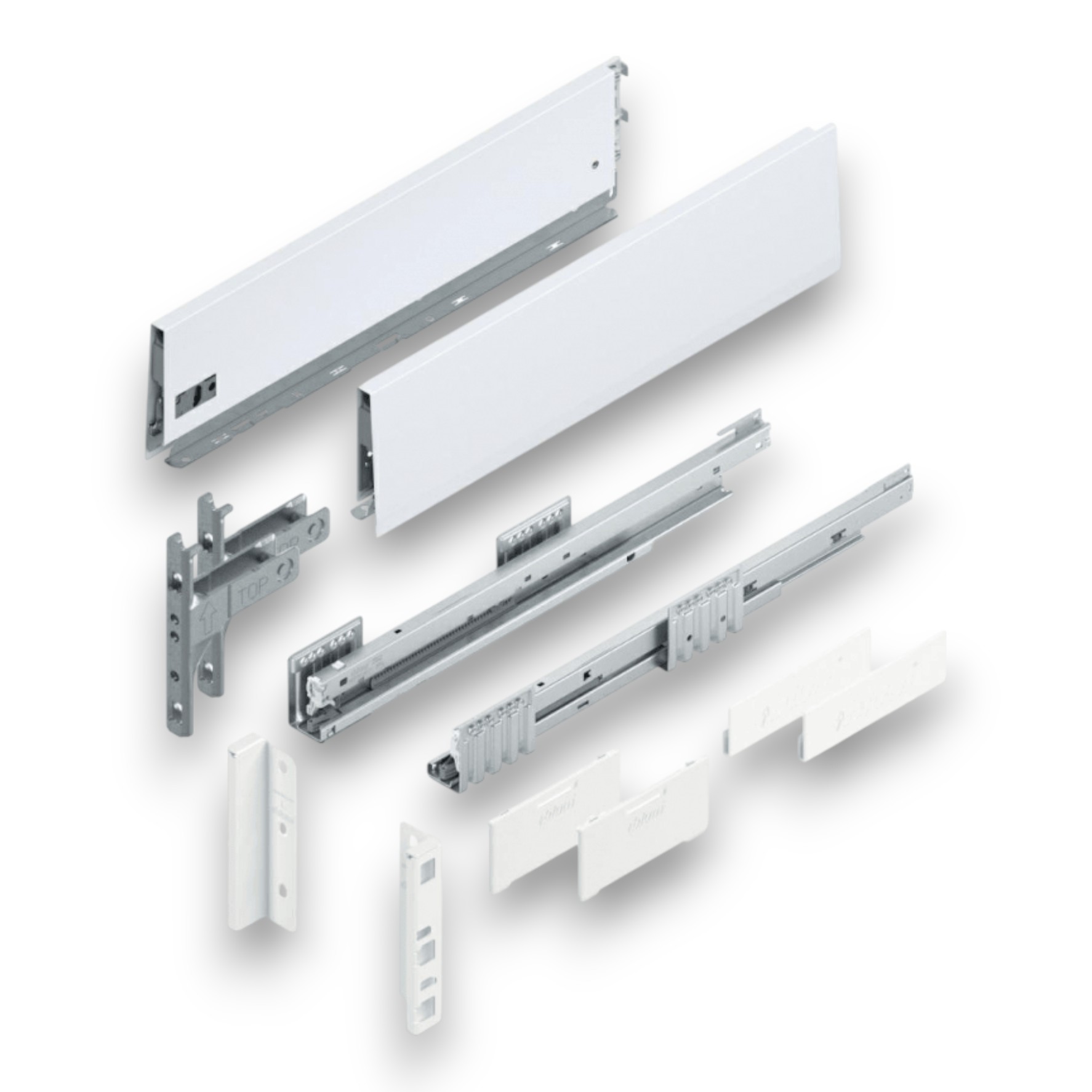 BLUM MERIVOBOX, Výška "K" (129 mm), 40 kg, Biela – Kompletná Sada s Tlmením Vytvorte si elegantné a funkčné zásuvky s kompletnou sadou BLUM MERIVOBOX v bielej farbe. Tento moderný boxový systém s jasnými líniami a nosnosťou 40 kg zaisťuje mimoriadne ľahký chod a plynulý pohyb. Ideálne pre vyššie zásuvky vyžadujúce väčší úložný priestor.