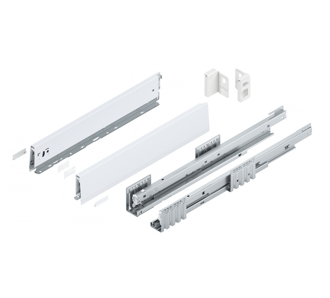 BLUM MERIVOBOX, Výška "N" (68,5 mm), 40 kg, Biela – Kompletná Sada s Tlmením Vytvorte si elegantné a super-plytké zásuvky s kompletnou sadou BLUM MERIVOBOX v bielej farbe. Tento moderný boxový systém s jasnými líniami a nosnosťou 40 kg zaisťuje mimoriadne ľahký chod a plynulý pohyb. Ideálne pre plytké zásuvky na príbory, náradie alebo kdekoľvek potrebujete minimálnu výšku.