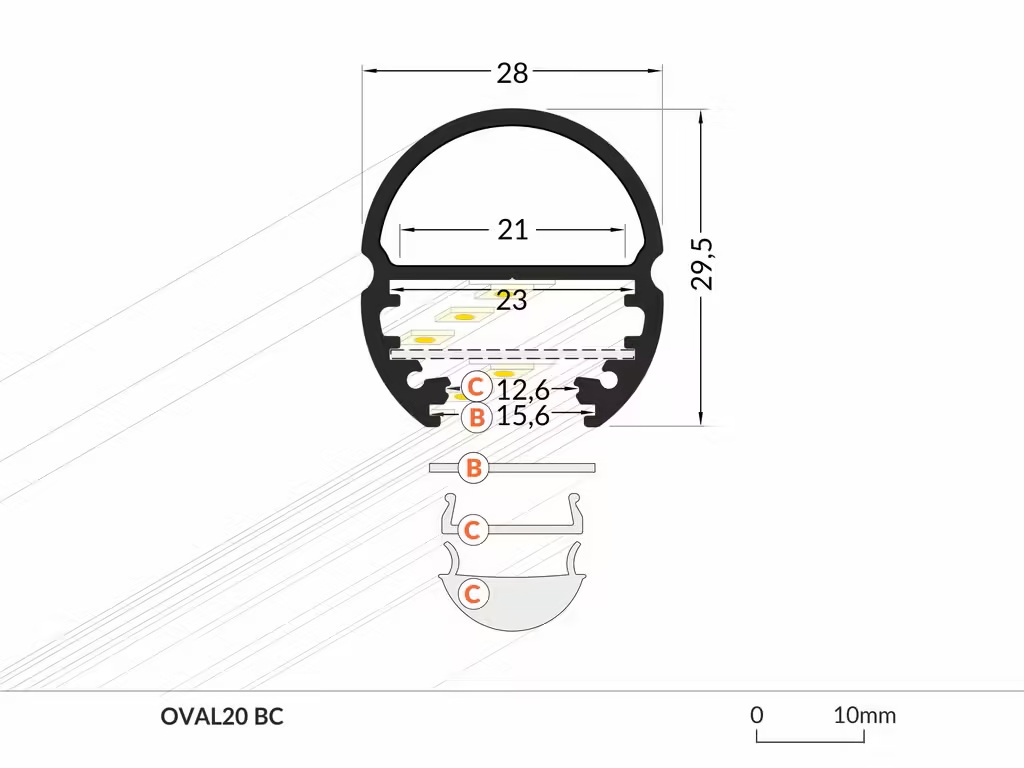 LED PROFIL ŠATNIKOVÝ OVAL20 BC, ELOXOVANÝ HLINÍK, 2M
