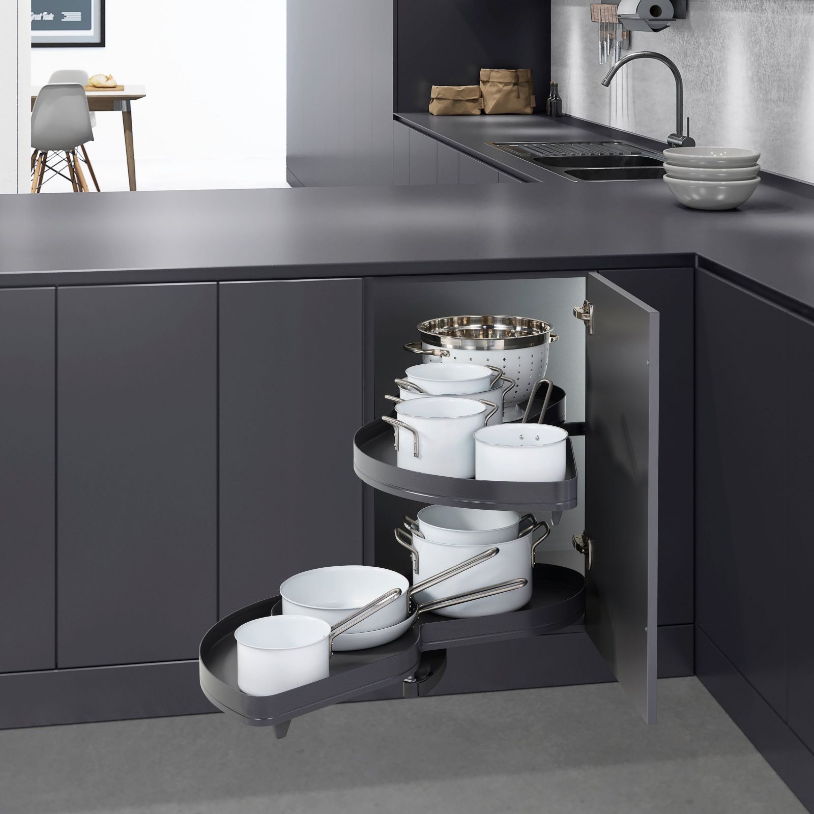 Zabudnite na neprístupné miesta v rohovej skrinke! Systém LEMANS II s košmi ARENA PLUS PURE v elegantnom antracitovom prevedení a ľavom vyhotovení vám ponúka dokonalý prehľad a jednoduchý prístup k uloženým veciam. Navyše, protišmykové police zabránia posúvaniu predmetov pri otváraní a zatváraní.