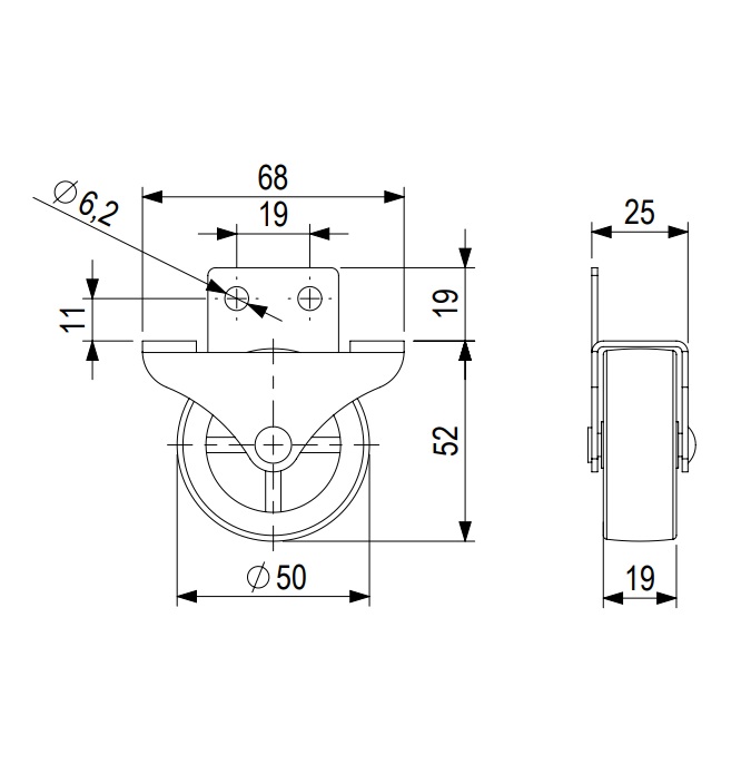 NÁBYTKOVÉ KOLIESKO PRIAME S BOČNÝM UCHYTENÍM, ø50MM