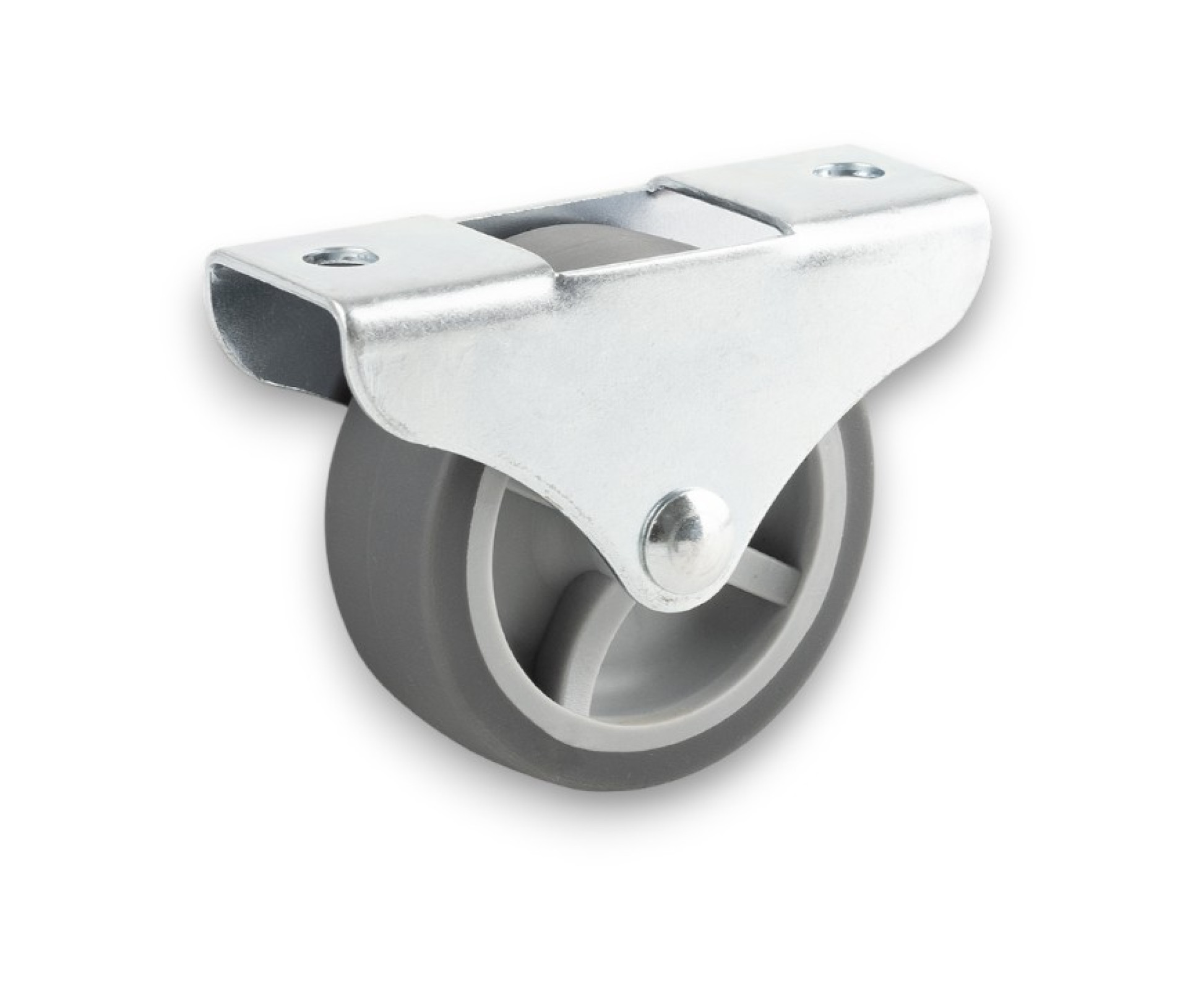 Nábytkové koliesko pevné s mäkčeným behúňom (pre tvrdé podlahy) a kovovým uchytením osi.