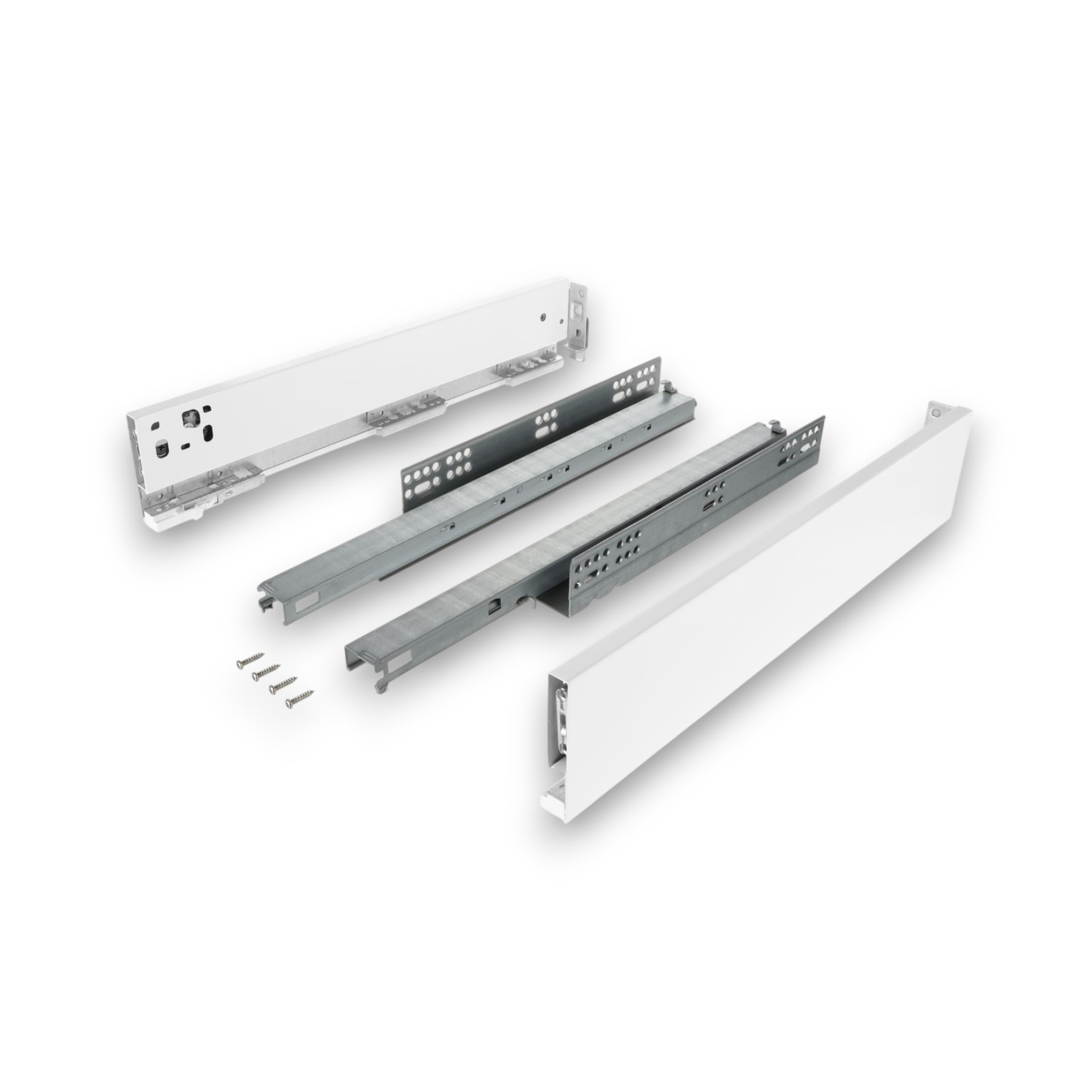 Sada na zostavenie zásuvky s tenkými, dutými bočnicami a plnovýsuvmi s tlmeným doťahom. Zásuvka je ľahko a rýchlo